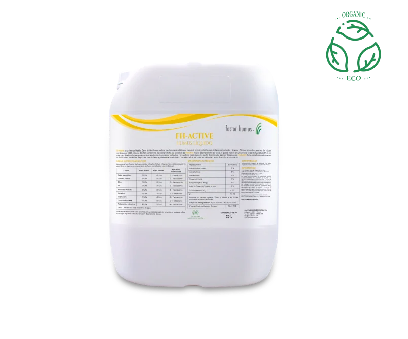 Fh-Active es un humus líquido. Es un fertilizante que contiene los elementos solubles de humus de lombriz, entre los que destacamos los ácidos húmicos y fúlvicos entre otros, además del inóculo microbiano de 2.000 millones de ufc/l, componente clave del producto.