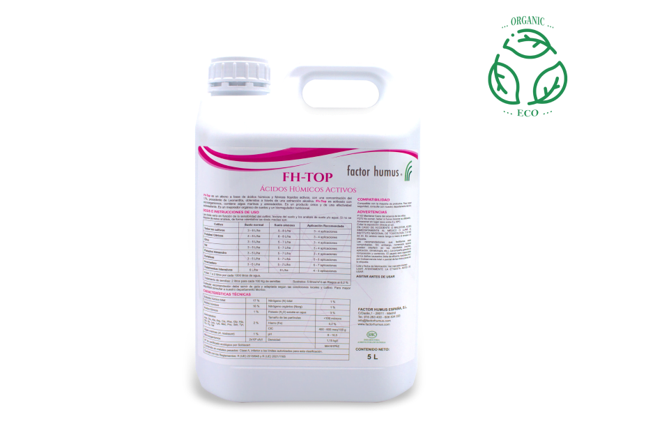 Abono a base de ácidos húmicos y fúlvicos líquidos activos, con una concentración del 17% procedente de Leonardita, obtenidos a través de una extracción alcalina. Fh-Top es un mejorador orgánico de suelo y un regulador nutricional