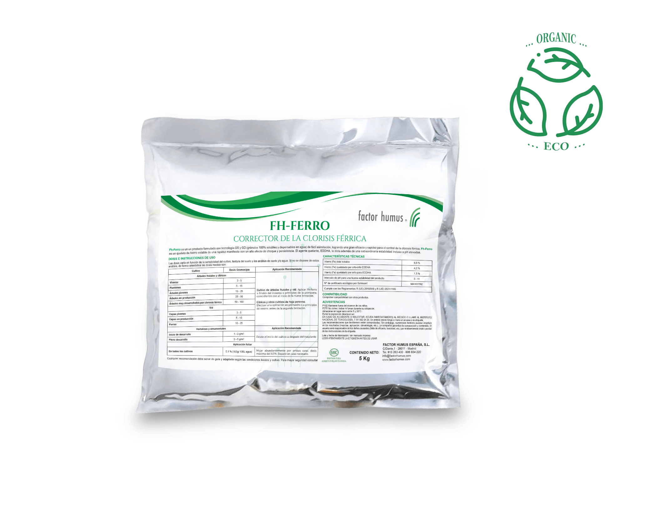 Fh-Ferro es un producto formulado con tecnología GS y GD (gránulos 100% solubles y dispersables en agua) de fácil asimilación, logrando una gran eficacia y rapidez para el control de la clorosis férrica.